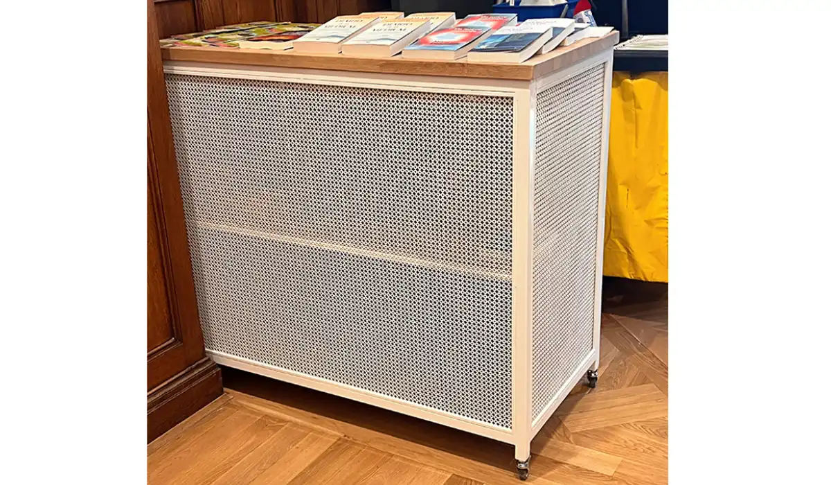 Fabricado con una estructura de hierro lacada en blanco y encimera de roble macizo, este mostrador stand te ofrece una superficie amplia para exponer productos, atender clientes o utilizarlo como espacio de trabajo, a la vez que te proporciona un espacio de almacenamiento seguro con puertas abatibles y cerradura con llave. Su diseño moderno y minimalista lo convierte en una pieza decorativa que combina con cualquier estilo.